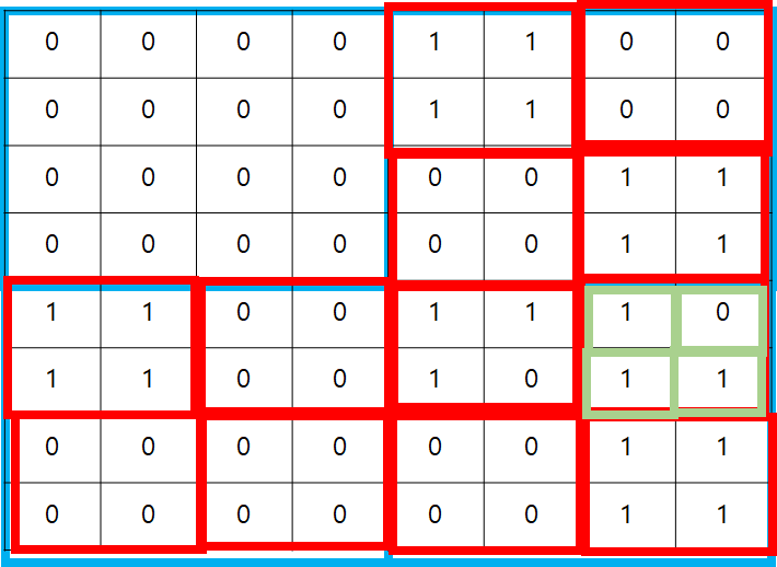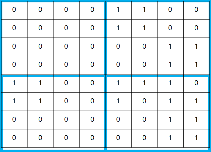 아래의 경우를 예를 들어보자. 모든 칸들의 숫자가 같지 않기 때문에, 4개의 역역으로 분할했다.