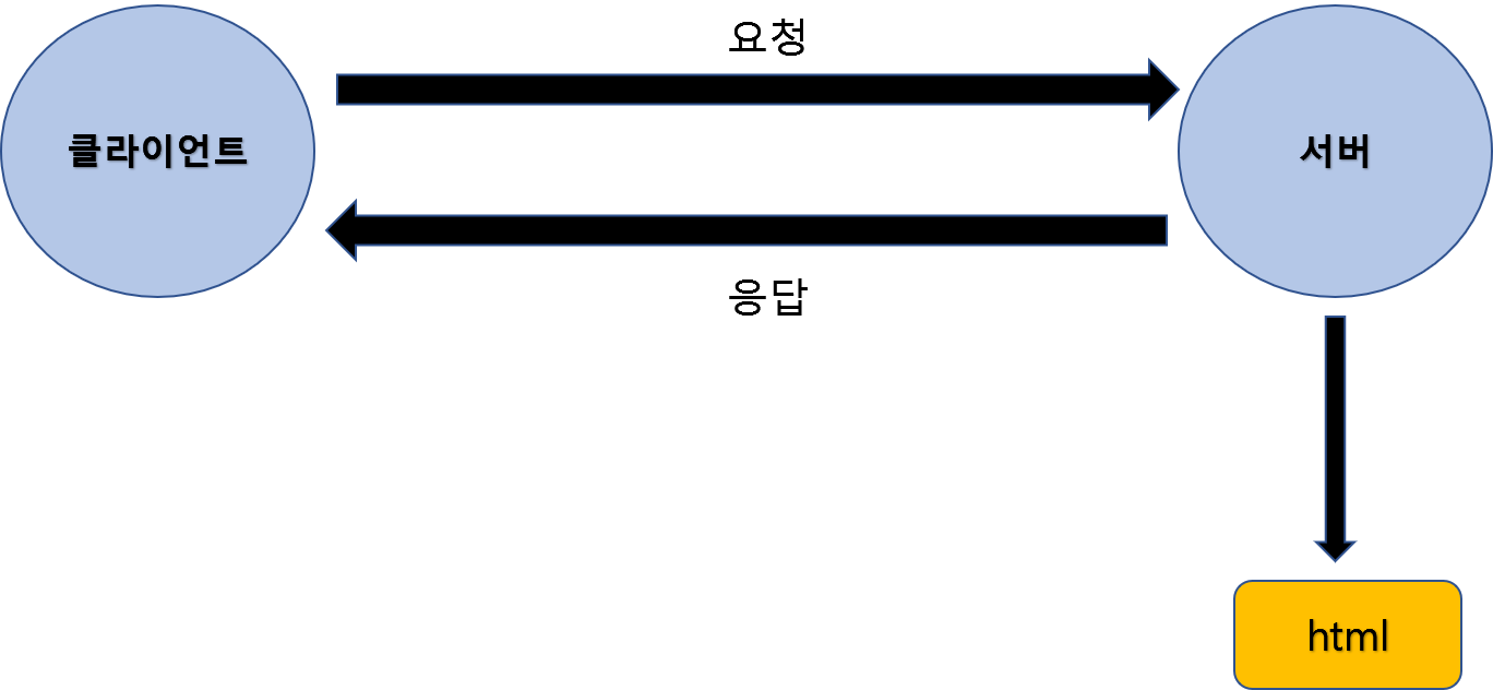 컴퓨터에서 웹 브라우저(크롬, 파이어폭스와 같은)에 주소를 입력하게 되면, 입력한 주소에 관한 파일을 (그림에는 html) 서버가 클라이언트 쪽(우리의 컴퓨터 PC)으로 전해준다.