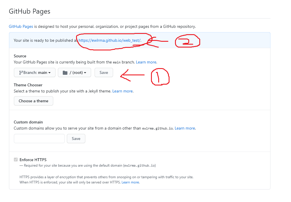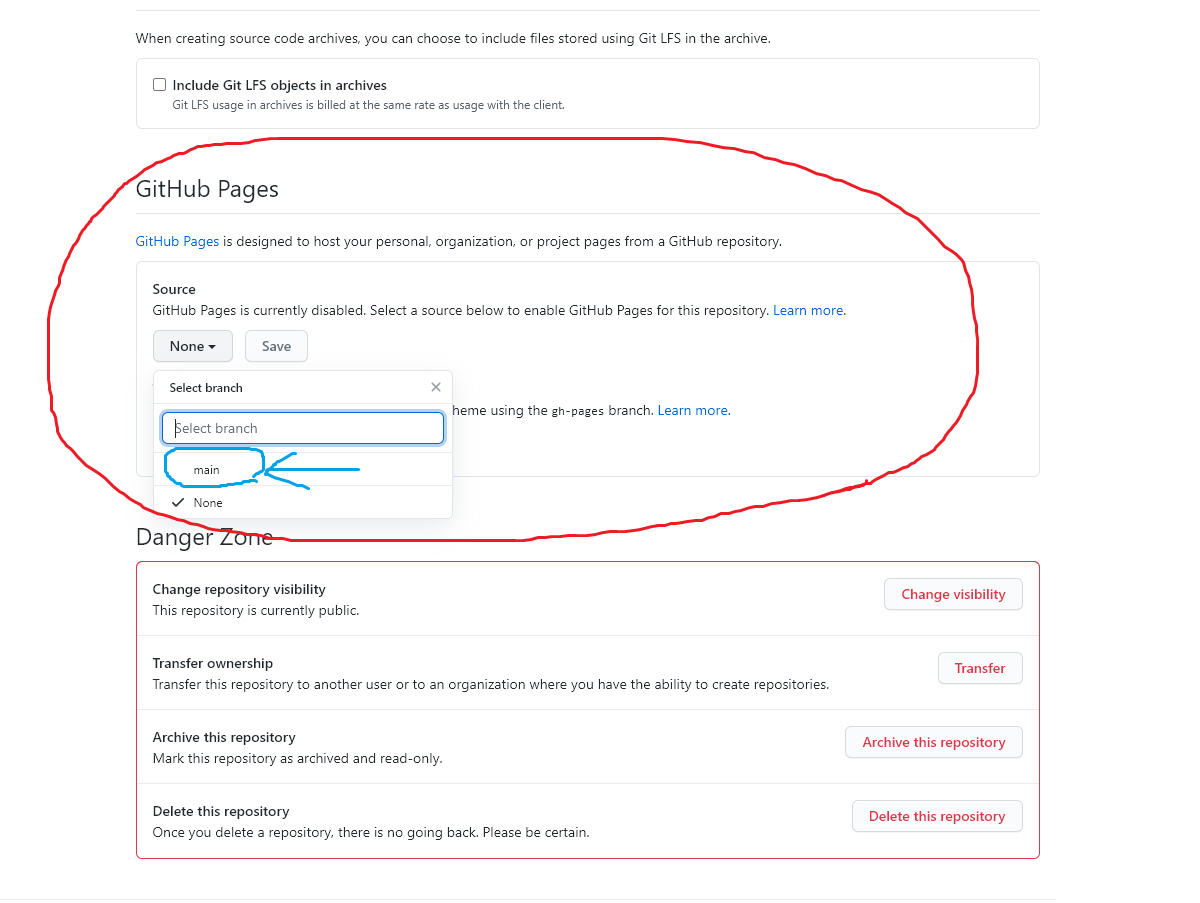 아래로 스크롤을 하다 보면, 깃허브 페이지라는 곳이 있는데, 저기서 main을 선택해준 다음,