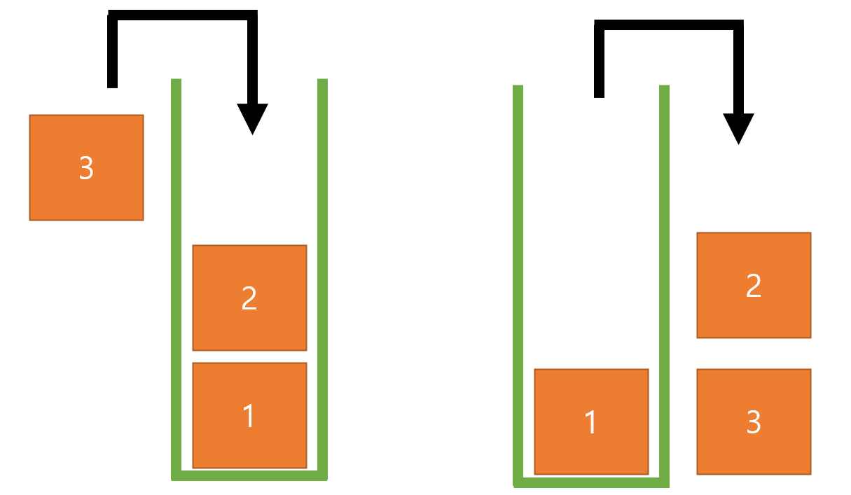 예를 들어서 위의 그림처럼 한쪽이 막혀있는 통에 숫자가 적혀있는 네모를 1->2->3 순서대로 넣었을 때,